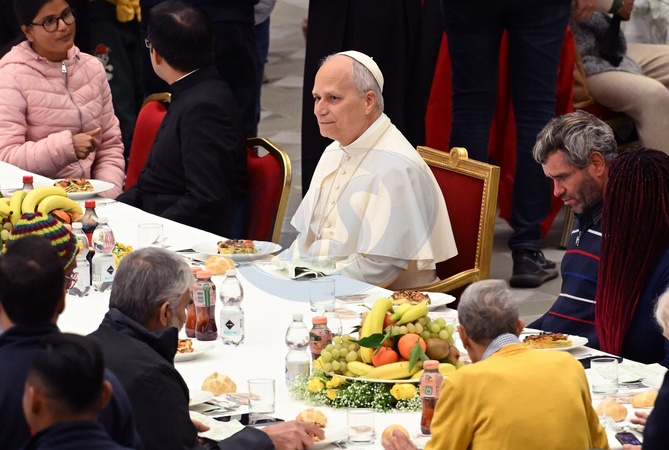 Pope Leo XIV attends a lunch with the poor on the occasion of the Jubilee of the Poor and the 9th World Day of the Poor inside the Paul VI Hall, Vatican City, 16 November 2025., Credit:Maria Laura Antonelli / Avalon