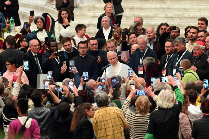 Pope Leo XIV attends a lunch with the poor on the occasion of the Jubilee of the Poor and the 9th World Day of the Poor inside the Paul VI Hall, Vatican City, 16 November 2025., Credit:Maria Laura Antonelli / Avalon
