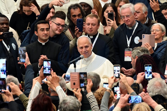 Pope Leo XIV attends a lunch with the poor on the occasion of the Jubilee of the Poor and the 9th World Day of the Poor inside the Paul VI Hall, Vatican City, 16 November 2025., Credit:Maria Laura Antonelli / Avalon