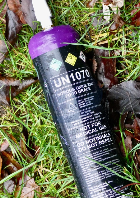 A large discarded can of Nitrous oxide, it is a colourless gas, also known as 'laughing gas'. It can be misused for its psychoactive effects or to 'get a high' by inhalation., Credit:Geoffrey Swaine / Avalon