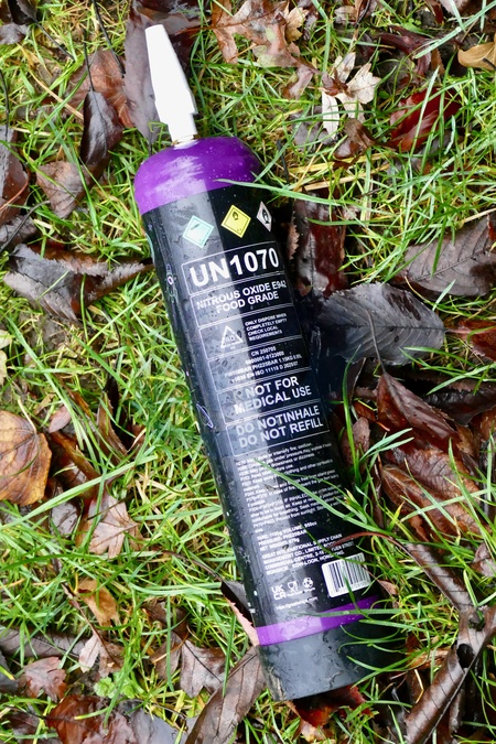 A large discarded can of Nitrous oxide, it is a colourless gas, also known as 'laughing gas'. It can be misused for its psychoactive effects or to 'get a high' by inhalation., Credit:Geoffrey Swaine / Avalon