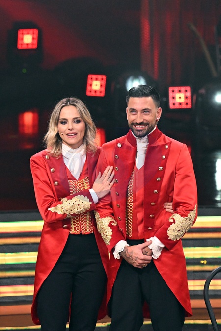 Rai1. Television program "Dancing with the Stars," twentieth edition. Pictured is Milly Carlucci with Francesca Fialdini, who is injured and unable to dance due to fractures, with maestro Giovanni Pernice. Rome, Nov 15th 2025, Credit:Maria Laura Antonelli / Avalon