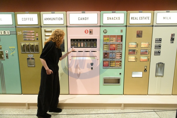 A staff member views A bank of Vending Machines created for 'Asteroid City' by Atelier Simon Weisse and Erica Dorn (2021) at a photocall for The Design Museum's 'Wes Anderson: The Archives' Exhibition at The Design Museum in London, England, UK on Monday 17 November 2025. The exhibition runs from 21 November 2025 - 26 July 2026., Credit:Justin Ng / Avalon