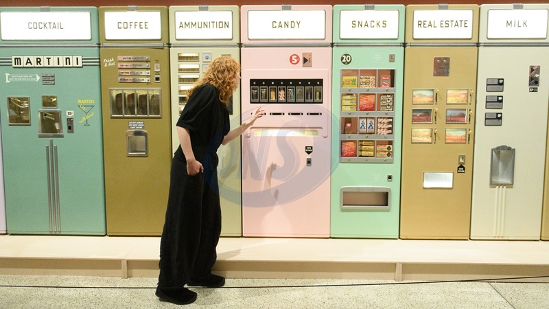 A staff member views A bank of Vending Machines created for 'Asteroid City' by Atelier Simon Weisse and Erica Dorn (2021) at a photocall for The Design Museum's 'Wes Anderson: The Archives' Exhibition at The Design Museum in London, England, UK on Monday 17 November 2025. The exhibition runs from 21 November 2025 - 26 July 2026., Credit:Justin Ng / Avalon