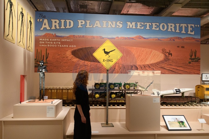 A staff member views Props created for 'Asteroid City' at a photocall for The Design Museum's 'Wes Anderson: The Archives' Exhibition at The Design Museum in London, England, UK on Monday 17 November 2025. The exhibition runs from 21 November 2025 - 26 July 2026., Credit:Justin Ng / Avalon