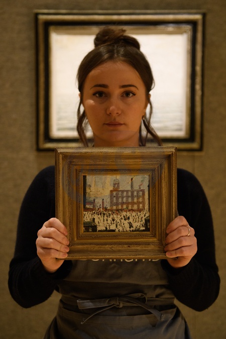 An Art handler holds 'Factory Scene' by LS Lowry (Laurence Stephen Lowry) (est. £70k - £100k) which is to go on auction at Bonhams' Modern British and Irish Art Sale on 19th November 2025 at Bonhams in London, England, UK on Monday 17 November, 2025., Credit:Justin Ng / Avalon