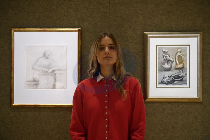 A staff member views (L) - 'Seated Woman' by Henry Moore (est. £7k - £10k) and (R) - 'Ideas for Sculpture' by Henry Moore (est. £15k - £20k) which is to go on auction at Bonhams' Modern British and Irish Art Sale on 19th November 2025 at Bonhams in London, England, UK on Monday 17 November, 2025., Credit:Justin Ng / Avalon