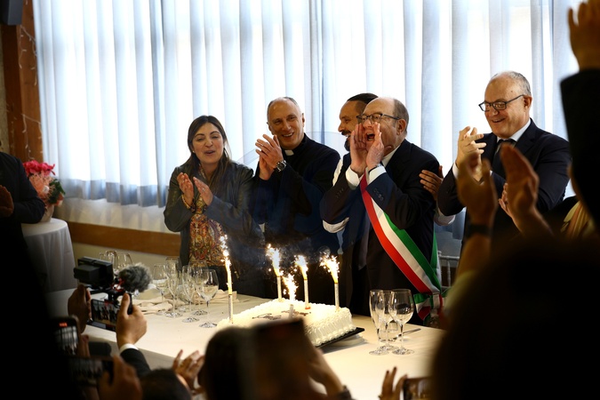 Carlo Verdone is mayor for a day. Lunch is held at the Cassia Senior Center. Pictured is Carlo Verdone, celebrating his 75th birthday with the Mayor of Rome, Roberto Gaultieri. Rome, Italy 17 November 2025, Credit:Francesco Fotia / Avalon