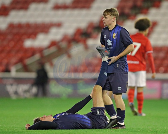 Mace Oldershaw of Mansfield Town U18's is aided by TJ Grimes of Mansfield Town U18's during the FA Youth Cup U18's round 2 match Barnsley vs Mansfield Town at Oakwell, Barnsley, United Kingdom, 17th November 2025, Credit:Sam Eaden/News Images / Avalon