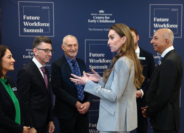 Britain's Catherine, Princess of Wales (3R) talks with British journalist and broadcaster Mishap Hussein (L), Yale Professor Marc Brackett (2L) and Harvard medical school professor Robert Waldinger (C), as she attends the The Future Workforce Summit, hosted by The Royal Foundation Business Taskforce for Early Childhood, in London on November 18, 2025. The Summit is set to bring together the UK's most influential business leaders in the hope of driving further action and investment in the early years., Credit:ADRIAN DENNIS / Avalon