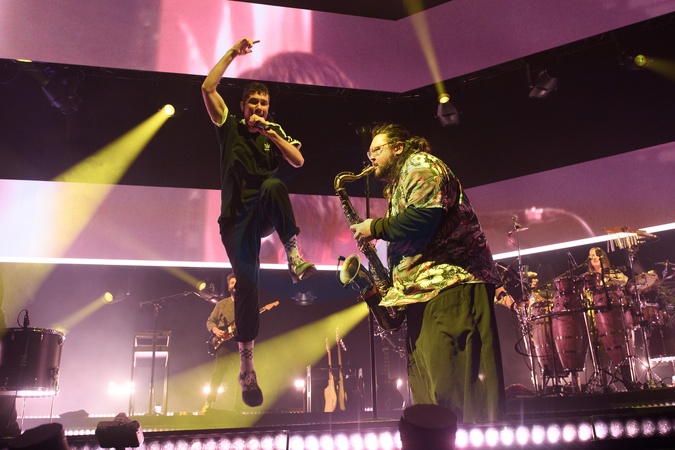 Lead singer Dan Smith and guest Saxophone player of English indie pop band Bastille performs at O2 Arena, London, England, UK on Tuesday 18 November 2025 as part of their "From All Sides" 2025 Tour., Credit:Justin Ng / Avalon