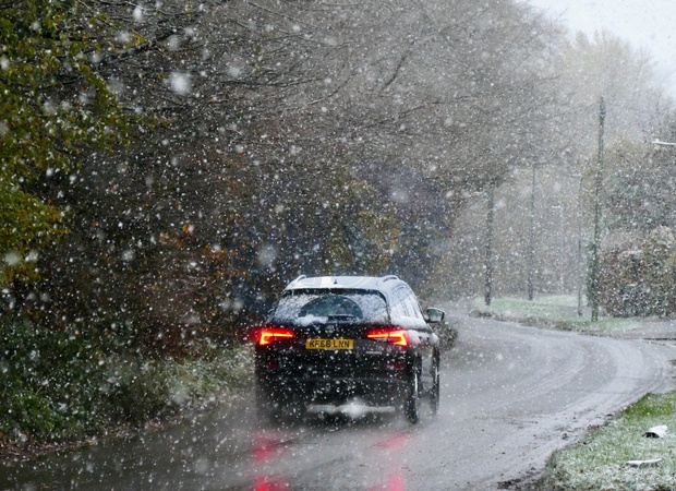Vehicles out in the wintery showers along the country lanes., Credit:Geoffrey Swaine / Avalon