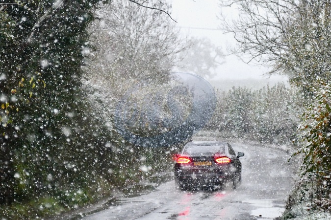 Vehicles out in the wintery showers along the country lanes., Credit:Geoffrey Swaine / Avalon