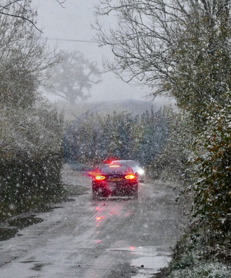 Vehicles out in the wintery showers along the country lanes., Credit:Geoffrey Swaine / Avalon
