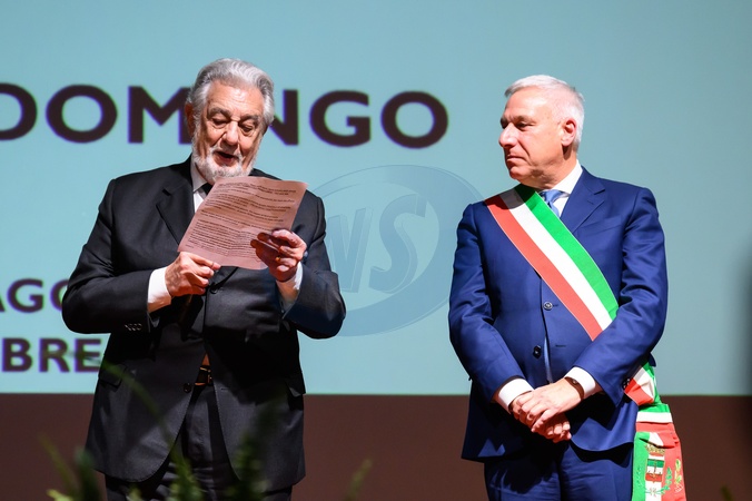 Opera singer Plácido Domingo receives the 2025 Puccini Award from Mayor Giorgio Del Gingaro, the President of the Puccini Festival, and artistic director Angelo Taddeo in the Caruso Auditorium of the Gran Teatro Giacomo Puccini in Torre del Lago. Pictured are Plácido Domingo and Mayor Giorgio Del Gingaro of Viareggio. Viareggio, Italy 18 November 2025, Credit:Stefano Dalle Luche / Avalon