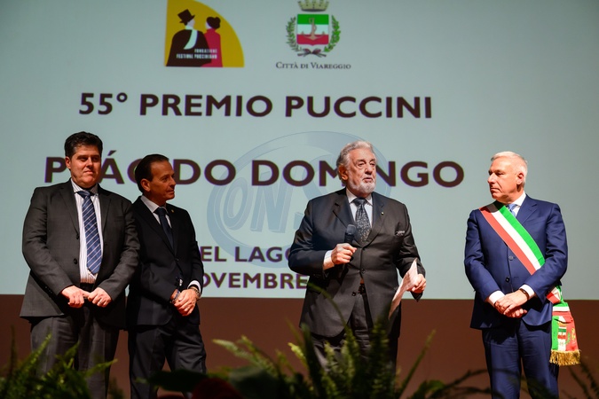 Opera singer Plácido Domingo receives the 2025 Puccini Award from Mayor Giorgio Del Gingaro, President of the Puccini Festival Fabrizio Miracolo, and Artistic Director Angelo Taddeo in the Caruso Auditorium of the Gran Teatro Giacomo Puccini in Torre del Lago. Pictured are Artistic Director Angelo Taddeo, President of the Puccini Festival Fabrizio Miracolo, Plácido Domingo, and Mayor of Viareggio Giorgio Del Gingaro. Viareggio, Italy 18 November 2025, Credit:Stefano Dalle Luche / Avalon