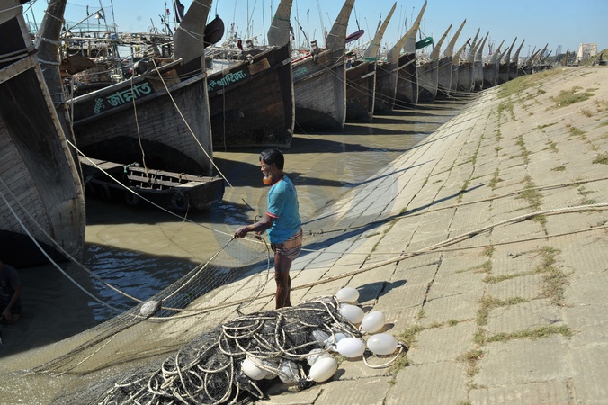 Chattogram, Bangladesh: After 10 days of deep-sea fishing in the Bay of Bengal, fishermen pack and repair their nets along the banks of the Karnaphuli River., Credit:Md Rafayat Haque Khan / Avalon