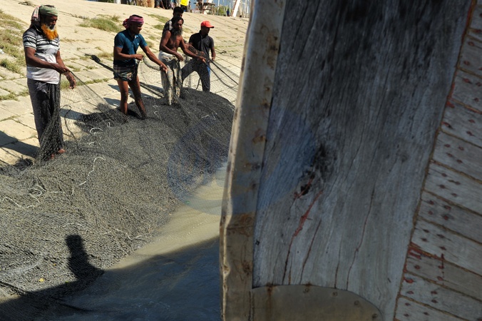 Chattogram, Bangladesh: After 10 days of deep-sea fishing in the Bay of Bengal, fishermen pack and repair their nets along the banks of the Karnaphuli River., Credit:Md Rafayat Haque Khan / Avalon