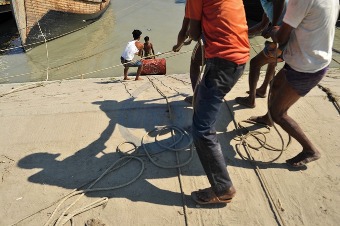 Chattogram, Bangladesh: Workers haul a rope-attached, used mobil-filled drum from the Karnaphuli River, showcasing daily labor along the city's vital waterway., Credit:Md Rafayat Haque Khan / Avalon