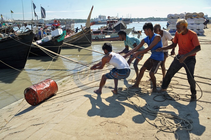 Chattogram, Bangladesh: Workers haul a rope-attached, used mobil-filled drum from the Karnaphuli River, showcasing daily labor along the city's vital waterway., Credit:Md Rafayat Haque Khan / Avalon