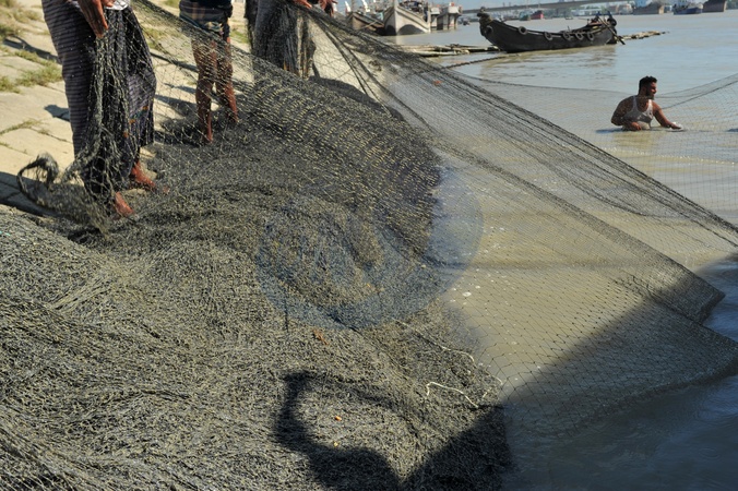 Chattogram, Bangladesh: After 10 days of deep-sea fishing in the Bay of Bengal, fishermen pack and repair their nets along the banks of the Karnaphuli River., Credit:Md Rafayat Haque Khan / Avalon