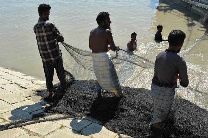Chattogram, Bangladesh: After 10 days of deep-sea fishing in the Bay of Bengal, fishermen pack and repair their nets along the banks of the Karnaphuli River., Credit:Md Rafayat Haque Khan / Avalon