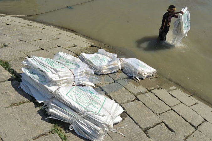 Chattogram, Bangladesh: A worker washes chemical powder used plastic bags in the waters of the Karnaphuli River for reuse, highlighting the ongoing challenges of informal recycling practices and river contamination., Credit:Md Rafayat Haque Khan / Avalon