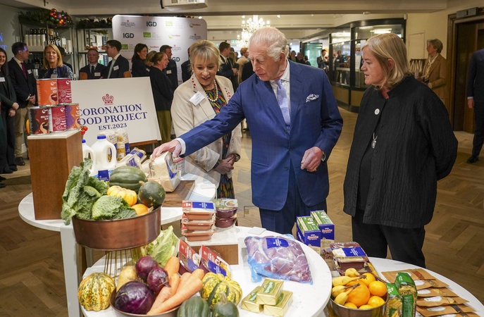 His Majesty The King marked the second.anniversary of the Coronation Food Project, bringing together Chief Executives and senior.leaders from Alliance Food Sourcing - a collaborative group which is leading to systemic.change in the food production and retail sector, rescuing thousands of tonnes more food for.communities in need. Fortnum & Mason, 181 Piccadilly, London W1A. The King with Dame Martina Milburn and Dame Louise Casey, Credit:Avalon.red / Avalon