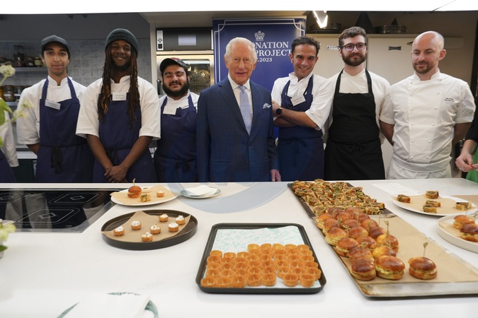 His Majesty The King marked the second.anniversary of the Coronation Food Project, bringing together Chief Executives and senior.leaders from Alliance Food Sourcing - a collaborative group which is leading to systemic.change in the food production and retail sector, rescuing thousands of tonnes more food for.communities in need. Fortnum & Mason, 181 Piccadilly, London W1A. The King with Apprentice chefs, Credit:Avalon.red / Avalon