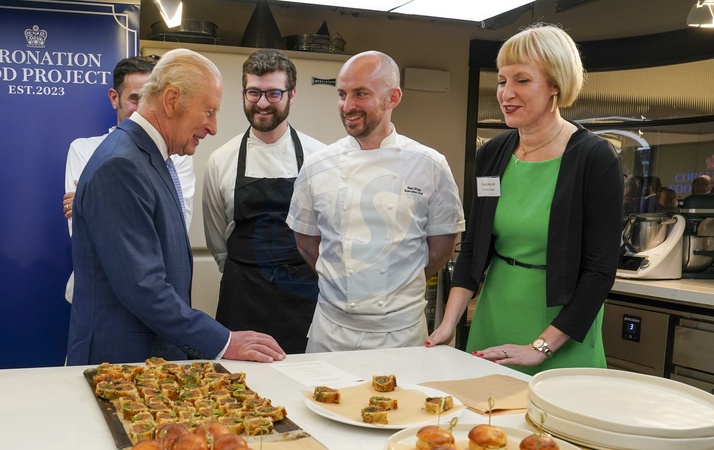 His Majesty The King marked the second.anniversary of the Coronation Food Project, bringing together Chief Executives and senior.leaders from Alliance Food Sourcing - a collaborative group which is leading to systemic.change in the food production and retail sector, rescuing thousands of tonnes more food for.communities in need. Fortnum & Mason, 181 Piccadilly, London W1A. The King with Apprentice chefs, Credit:Avalon.red / Avalon