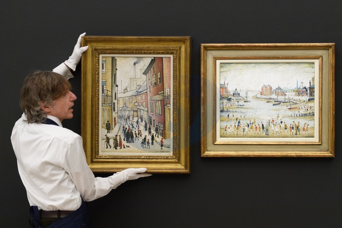 A technician holds up (L) - 'An Old Street' by L.S. Lowry (Laurence Stephen Lowry) (est. £800k - £1.2m) and (R) - 'The Estuary' by L.S. Lowry (Laurence Stephen Lowry) (est. £700k - £1m) which is to go on auction at Sotheby's Modern British and Irish Art Evening Auction on 25th November 2025 at Sotheby's, London, England, UK on Wednesday 19 November, 2025., Credit:Justin Ng / Avalon