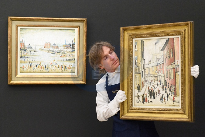 A technician holds up (L) - 'The Estuary' by L.S. Lowry (Laurence Stephen Lowry) (est. £700k - £1m) and (R) - 'An Old Street' by L.S. Lowry (Laurence Stephen Lowry) (est. £800k - £1.2m) and which is to go on auction at Sotheby's Modern British and Irish Art Evening Auction on 25th November 2025 at Sotheby's, London, England, UK on Wednesday 19 November, 2025., Credit:Justin Ng / Avalon