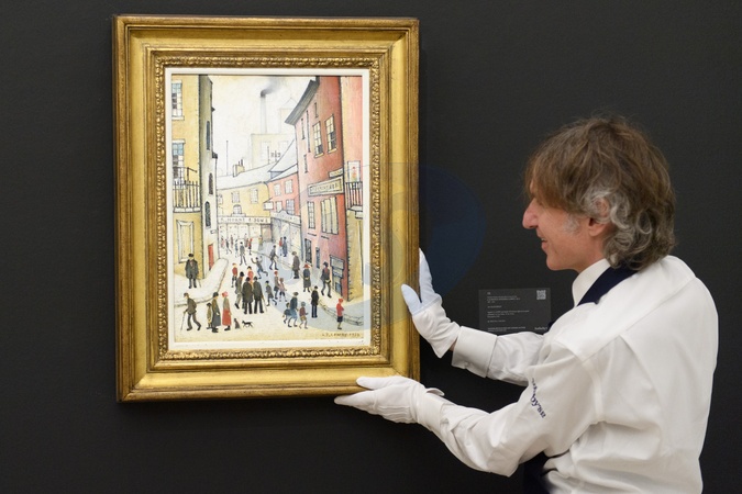 A technician holds up 'An Old Street' by L.S. Lowry (Laurence Stephen Lowry) (est. £800k - £1.2m) and which is to go on auction at Sotheby's Modern British and Irish Art Evening Auction on 25th November 2025 at Sotheby's, London, England, UK on Wednesday 19 November, 2025., Credit:Justin Ng / Avalon