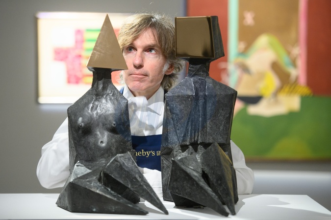 A staff member views 'Pair of Sitting Figures VI' by Lynn Chadwick (est. £100k - £150k) which is to go on auction at Sotheby's Modern British and Irish Art Evening Auction on 25th November 2025 at Sotheby's, London, England, UK on Wednesday 19 November, 2025., Credit:Justin Ng / Avalon