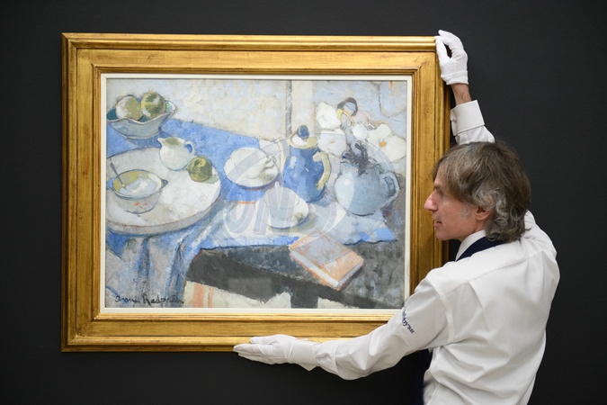 A staff member views 'The Blue Tablecloth' by Anne Redpath (est. £120k - £180k) which is to go on auction at Sotheby's Modern British and Irish Art Evening Auction on 25th November 2025 at Sotheby's, London, England, UK on Wednesday 19 November, 2025., Credit:Justin Ng / Avalon