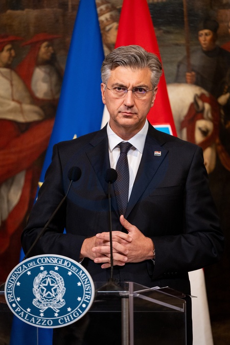 Prime Minister of the Republic of Croatia, Andrej Plenković addresses a press conference after the meeting with the Italian Prime Minister Giorgia Meloni, at Palazzo Chigi in Rome, Italy, on 19 November 2025., Credit:Stefano Costantino TTL / Avalon