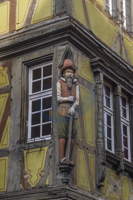 France, Alsace region, Colmar, Scuplture of a draper or merchant (marchand) decorates the corner of the half-timbered house Maison Zum Kragen, Rue des MarchandsPhoto Fabio Mazzarella/Sintesi *** Local Caption ***, Credit:Fabio Mazzarella / Avalon