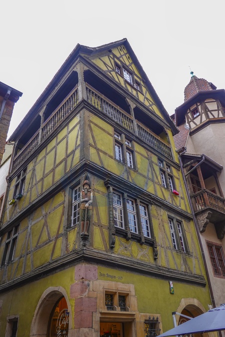 France, Alsace region, Colmar, Scuplture of a draper or merchant (marchand) decorates the corner of the half-timbered house Maison Zum Kragen, Rue des MarchandsPhoto Fabio Mazzarella/Sintesi *** Local Caption ***, Credit:Fabio Mazzarella / Avalon