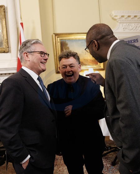 19/11/2025. London, United Kingdom. Prime Minister Keir Starmer speaks with Anderson Boyce and Mark Rayment of Barbers Against Prostate Cancer as he attends a reception in 10 Downing Street to celebrate International Men's Day, Credit:Simon Dawson / Avalon