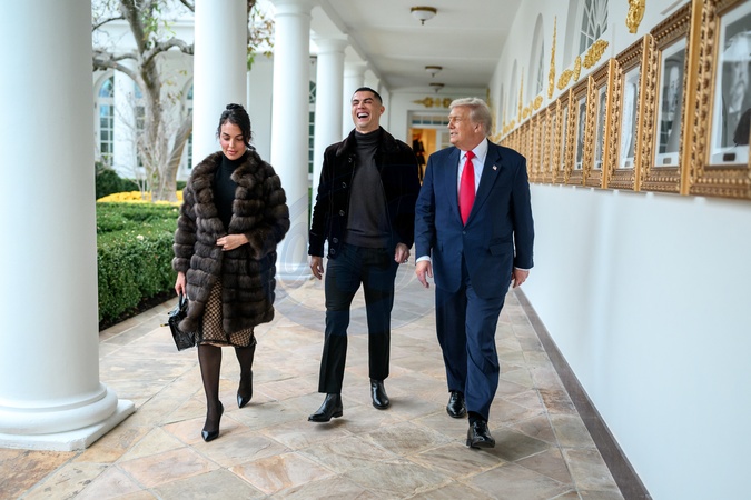 President Donald Trump walks with Cristiano Ronaldo and Georgina Rodríguez on the West Colonnade of the White House, Tuesday, November 18, 2025., Credit:Daniel Torok / Avalon