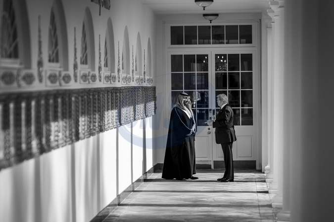 President Donald Trump and Crown Prince and Prime Minister Mohammed bin Salman Al Saud of Saudi Arabia speak on the West Colonnade of the White House, Tuesday, November 18, 2025., Credit:Daniel Torok / Avalon