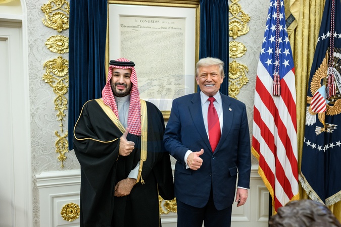 President Donald Trump poses for photos with Crown Prince and Prime Minister Mohammed bin Salman Al Saud of Saudi Arabia, Tuesday, November 18, 2025, in the Oval Office., Credit:Daniel Torok / Avalon