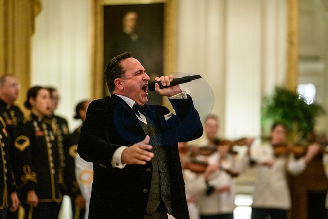 Tenor Christopher Maccio and the President's Own Marine Band Orchestra perform at a dinner for Crown Prince and Prime Minister Mohammed bin Salman Al Saud of Saudi Arabia, Tuesday, November 18, 2025, in the East Room of the White House., Credit:Daniel Torok / Avalon