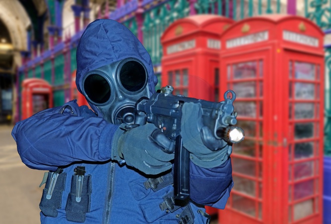 Digitally layered images of firearms officer , with added London backgrounds, representing the added pressure and danger London's Police officers now face. London. UK.