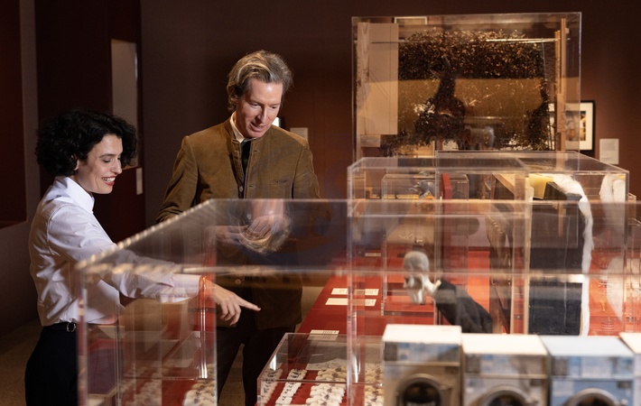 EDITORIAL USE ONLYWes Anderson unveils a retrospective exhibition of his films including The Royal Tenenbaums, Asteroid City and The Phoenician Scheme at the Design Museum in London, featuring over 700 objects including the candy-pink model of the Grand Budapest Hotel, original storyboards, costumes, stop-motion puppets, and handwritten notebooks. Issue date: Wednesday November 19, 2025. The exhibition which opens to the public on Friday offers a look at the director's carefully crafted archives and his signature filmmaking style., Credit:Matt Alexander/PA Media Assignments / Avalon