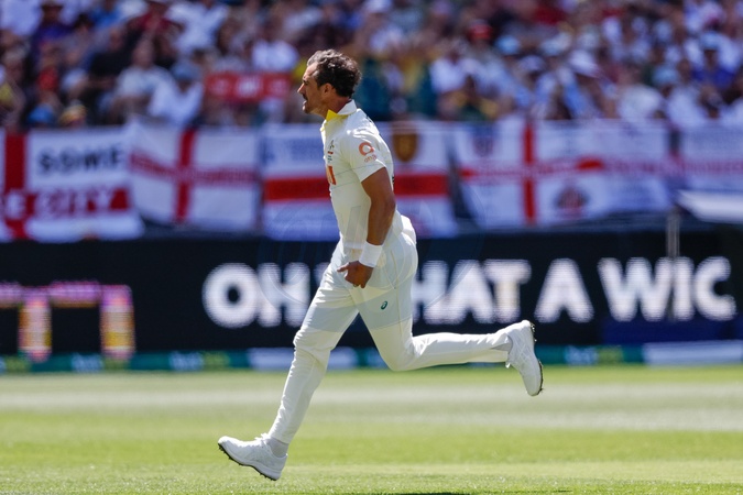 Mitch Starc of Australia celebrates the wicket of Zak Crawley of England during the NRMA Insurance Ashes First Test Day 1 Series Australia vs England at Optus Stadium, Perth, Australia, 20th November 2025, Credit:Santanu Banik/News Images / Avalon