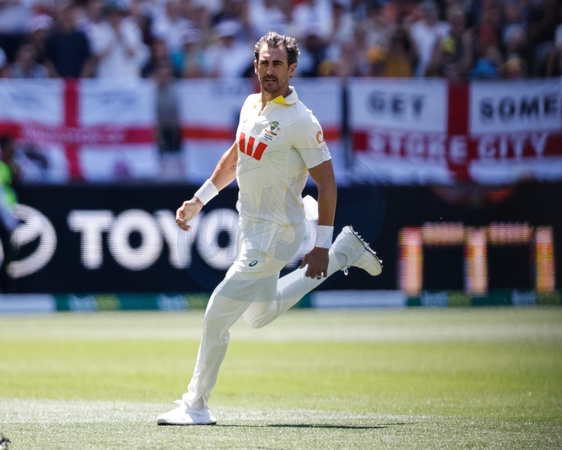 Mitch Starc of Australia celebrates the wicket of Zak Crawley of England during the NRMA Insurance Ashes First Test Day 1 Series Australia vs England at Optus Stadium, Perth, Australia, 20th November 2025, Credit:Santanu Banik/News Images / Avalon