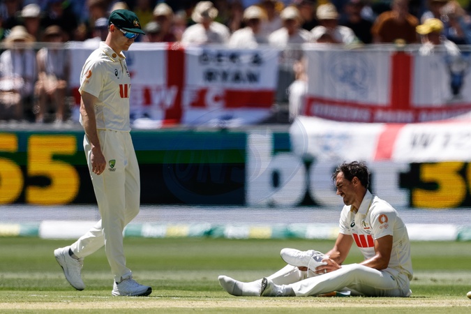 Mitch Starc of Australia loses a spike on his boot during the NRMA Insurance Ashes First Test Day 1 Series Australia vs England at Optus Stadium, Perth, Australia, 20th November 2025, Credit:Santanu Banik/News Images / Avalon