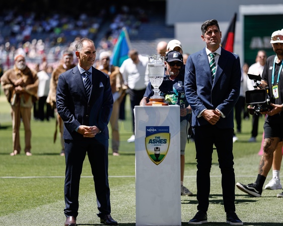Justin Langer and Sir Alastair Cook CBE during the NRMA Insurance Ashes First Test Day 1 Series Australia vs England at Optus Stadium, Perth, Australia, 20th November 2025, Credit:Santanu Banik/News Images / Avalon