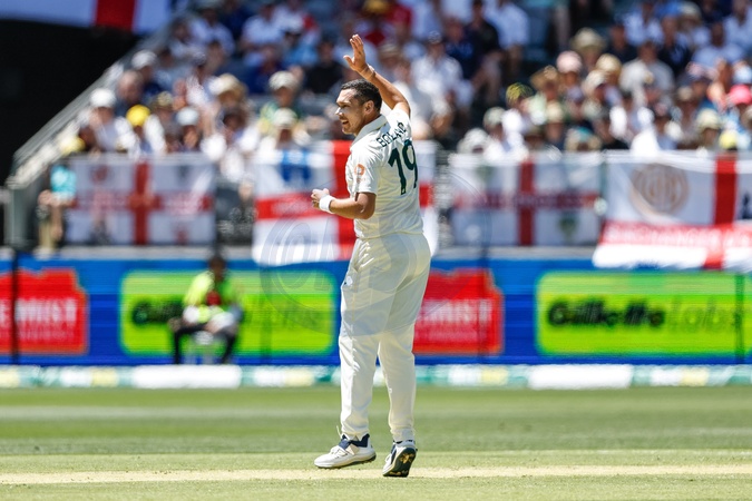 Scott Boland of Australia reacts during the NRMA Insurance Ashes First Test Day 1 Series Australia vs England at Optus Stadium, Perth, Australia, 20th November 2025, Credit:Santanu Banik/News Images / Avalon
